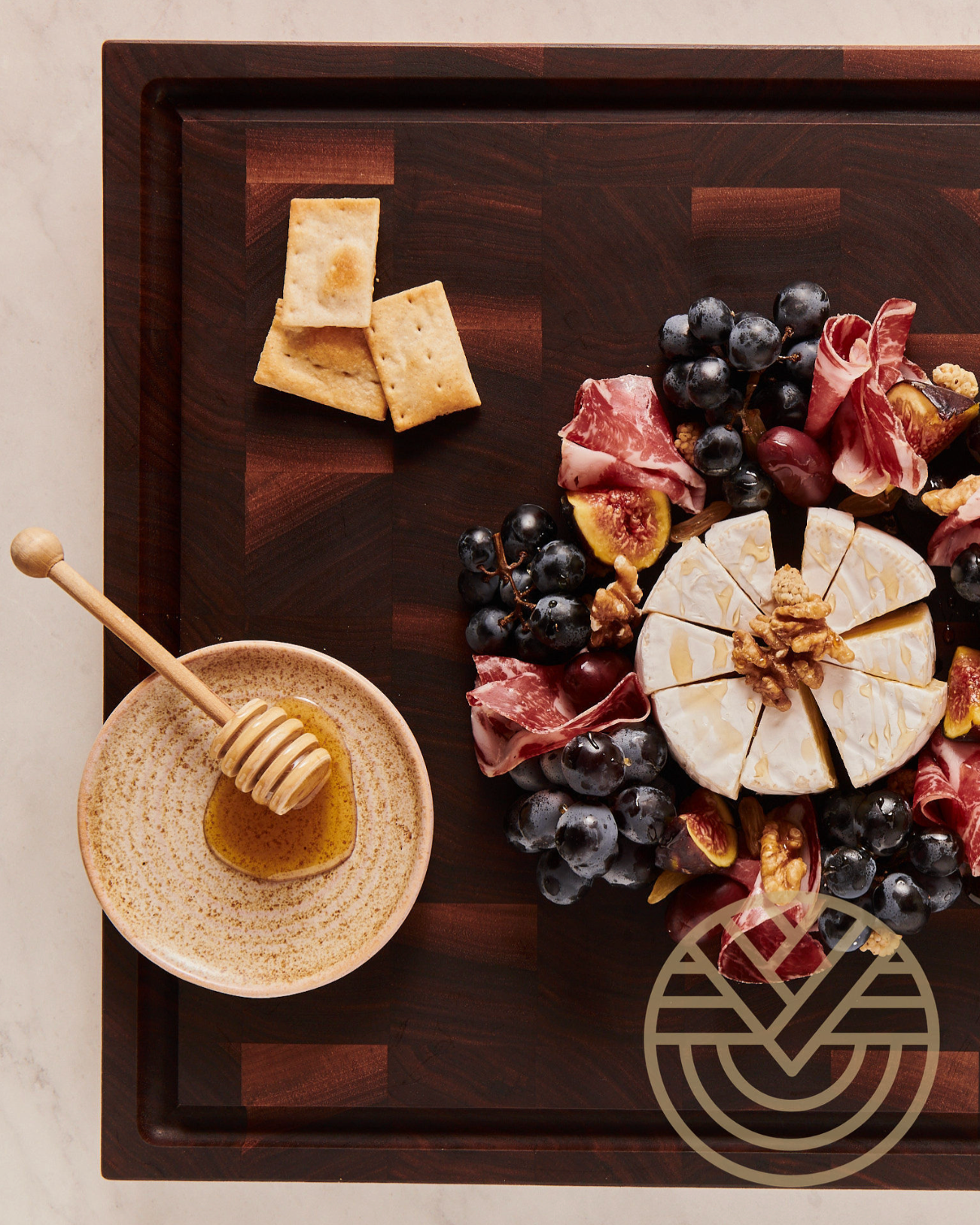 Two sides, two purposes. The board is flat on one side, and has a carved juice channel on the other. Use the groove side for proteins, and the other for bread, produce, or cheese. A fully reversible board extends longevity by doubling the cutting surface, meaning less wear on either side. It also provides more versatility and reduces cross-contamination through the different functionality.
