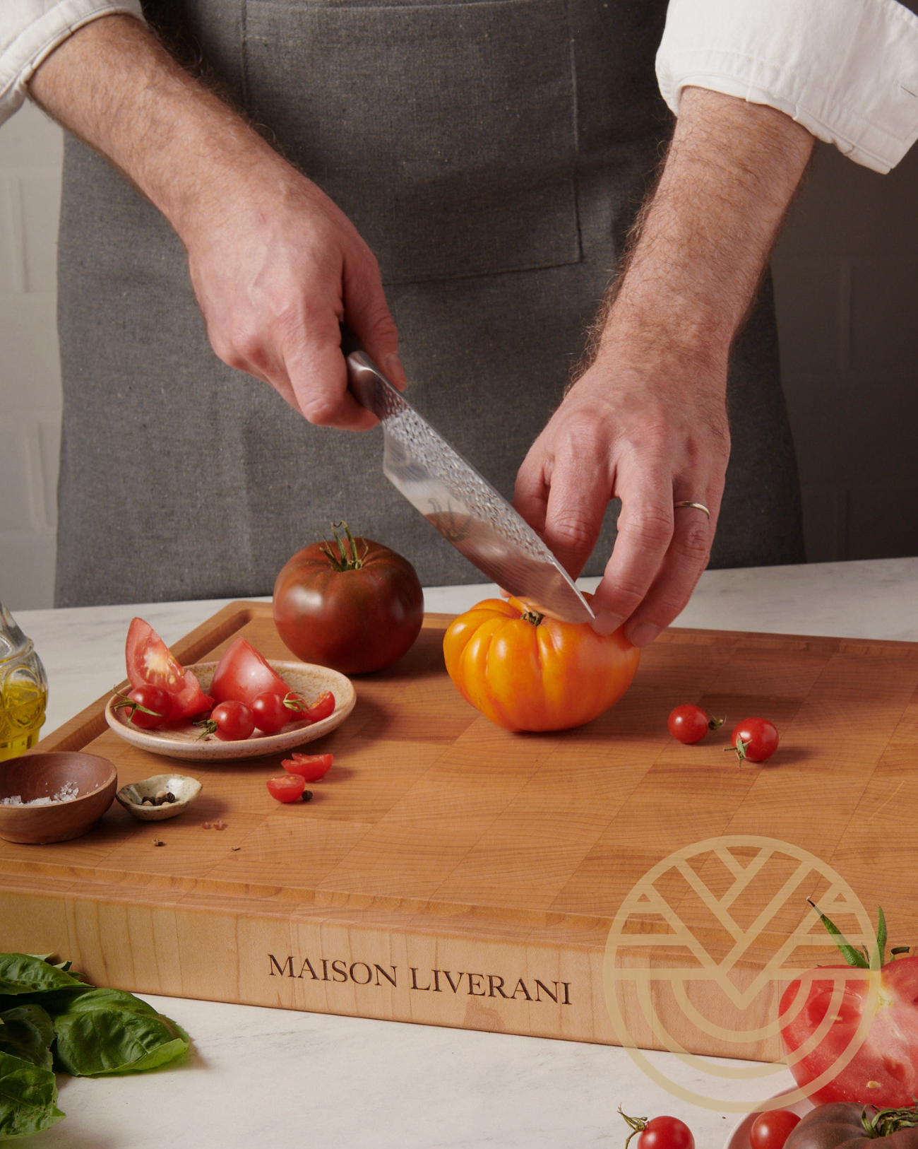 Aside from its elegant beauty, end grain is the ideal composition for your board, knives, and sanitation. End grain construction means the wood fibers stand vertically. As you cut, your knife blade slips between fibers instead of slicing across them. When the board is not being used, the fibers close back up, hiding knife marks and resisting deep scars or splits. It also helps prevent bacteria from getting trapped, keeping the surface safer.