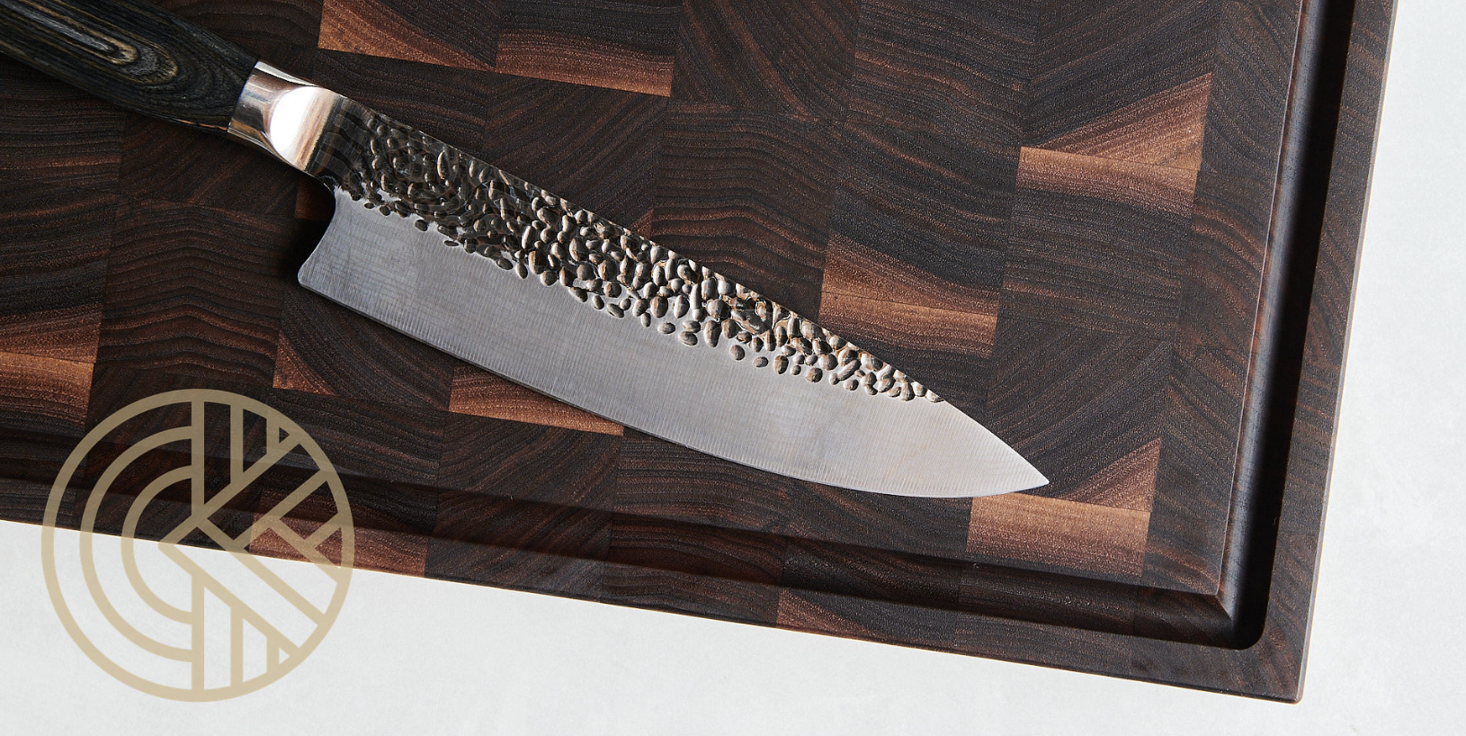 The board begins with solid FSC-certified, sustainably sourced hardwood, either black walnut or hard maple. Both of these wood species sit within the 900-1,500 lbf sweet spot for Janka hardness (the Janka test measures how resistant wood is to dents and wear). Maple rates 1,450 lbf, walnut 1,010 lbf. Wood below this range is too soft, and will dent and wear excessively from use. Wood above this range is too hard and dulls knives, while being more prone to cracking.